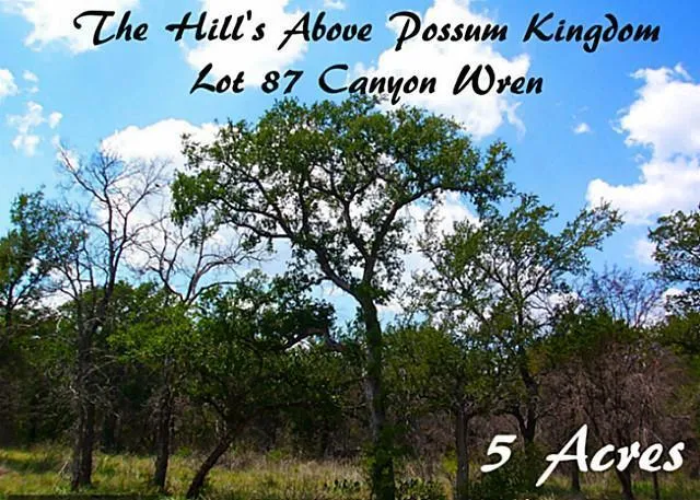 The Hills Above Possum Kingdom Lake Lot 87 is a wooded 5 Acre home site with many amenities including: Gated HOA, clubhouse with swimming pool, workout gym, boat launch, courtesy dock with boat slips, boat storage, club house at boat ramp, picnic area, fishing pond, paved road access, underground utilities. Many existing new homes and more being built. Stake your claim soon and start enjoying the PK Lake country, and get off the beaten path.