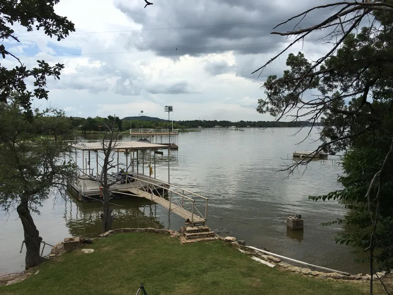 Awesome waterfront/lakefront five (5) bedroom, two (2) bath lake house (adjoined by a covered walkway) on the west side of Possum Kingdom Lake; 1.25 acre (m/l) (per owners) surface estate only waterfront lot with beautiful trees and open grassy areas; Private location with Elm creek running along the east side of property; Cove; Excellent fishing; Former catfish breeding area per owners; Huge, covered dock with electric, cable-driven boat lift for 20' boat or four jet skis with overhead lighting, spot lights and swim ladder; Sturdy metal walkway access onto dock; Pipe rail ramp from lake to private, metal boathouse with electricity, roll-up door and walk-in door; Workshop on concrete with electricity is attached to boathouse and features a roll-up door and a walk-in door; Main cabin features open concept kitchen/dining/living areas with vaulted and beamed ceiling in the living room; Two sliding glass doors lead from the living room onto a 20' x 16' deck; Wonderful views of PK Lake; Kitchen boasts a free-standing electric range, refrigerator, lighted vent-a-hood, double stainless steel sink, garbage disposal, trash compactor and breakfast bar seating (all appliances convey including a 2nd refrigerator in bunkhouse); Breakfast nook dining area adjacent to the kitchen has a window overlooking the deck and lake; Two (2) bedrooms in the main cabin are separated by a full-size bathroom with large vanity/sink, tub/shower combination, toilet, and built-in linen cabinetry with drawers/nook; Two central heat and air units (one for main cabin and one for bunkhouse), The bunkhouse has a living/dining area combination, three (3) bedrooms, one (1) extra-large full bathroom with make-up vanity ,medicine cabinets, step-in shower, toilet, and ample built-in linen cabinet space; Utility room with full-size washer/dryer connections, built-in cabinets, utility sink and hot water heater; Total electric; Large storage closet in the hallway of bunkhouse; All bedrooms have carpet, individual closets, and built-in drawers with TV nooks; Intercom system; Ceiling fans and window coverings throughout; Wire fenced perimeter with wide metal gate leading into the property; This is an impressive, all inclusive lake property for family fun and/or corporate weekend entertainment!