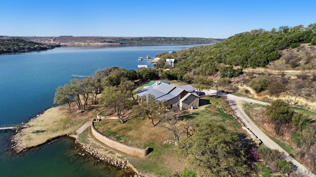Your private sanctuary awaits on PK Lake! Fantastic view with secluded feel on 1.48 acre lakefront lot. Located at the end of the road, there is no better view that also has a secluded feel on the lake. Enjoy a private oasis on the northwest side of Possum Kingdom which includes 4 bedrooms, an office, 2.5 baths, large windows in the living area overlooking the lake, a beautiful stone retaining wall, private boat slip, and a massive double-deck dock with 2 boat slips, one having a lift. Jump off the dock into 18ft-19ft deep water (when the lake is full) then shower off in the outside private shower before heading back up to the house. Opportunities to make it your own include a workshop/boat garage, eat-in pavilion, and a grand, stone patio to relax on while enjoying the lake views, not to mention the many oak trees that provide plenty of shade over the large backyard. Vaulted ceilings with exposed beams contribute to this beautiful, custom home where memories will be made for years to come.