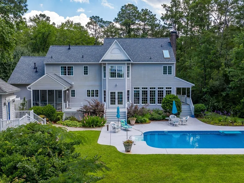 Gorgeous 3 bedroom 2.5 bath home on 2.3 acre private waterfront estate surrounded by beautiful landscaped grounds that provide a welcoming ambiance. The park-like wooded setting provides a perfect backdrop for the in-ground pool and for your boating pleasure, a back-yard dock only a few steps away. Minutes away from the village of Oriental and its many amenities. As you step inside the foyer, you are welcomed by light filled rooms and an engaging openness with walls of windows and spectacular water views Imagine relaxed entertaining or serene moments in the generously sized open concept family room, breakfast nook and kitchen with adjacent den and a beautiful formal dining room. Custom detailing includes tray ceilings, oak floors, pocket doors, tiled bathroom floors, and crown molding. Inside the kitchen, you'll experience a chef's dream kitchen with a Thermador cooktop, custom cabinetry, double ovens and plenty of storage. All three bedrooms are on the upper level and the generously sized master bedroom offers a large ensuite bath. Other features include a wood burning fireplace, separate laundry room, bonus room, waterside screened porch with tile floor, and a wrap around porch. The backyard gazebo houses an artist's studio/workshop with its own heating and cooling mini split system. An attached oversized double car garage compliments this lovely home. High quality craftsmanship and efficient use of space and functionality make this one of the most extraordinary homes on the market today. Minutes from town and its conveniences. Updates include new roof in 2020, new backyard fence, new trex decking at gazebo/poolhouse, pool converted to saltwater, and kitchen updated.