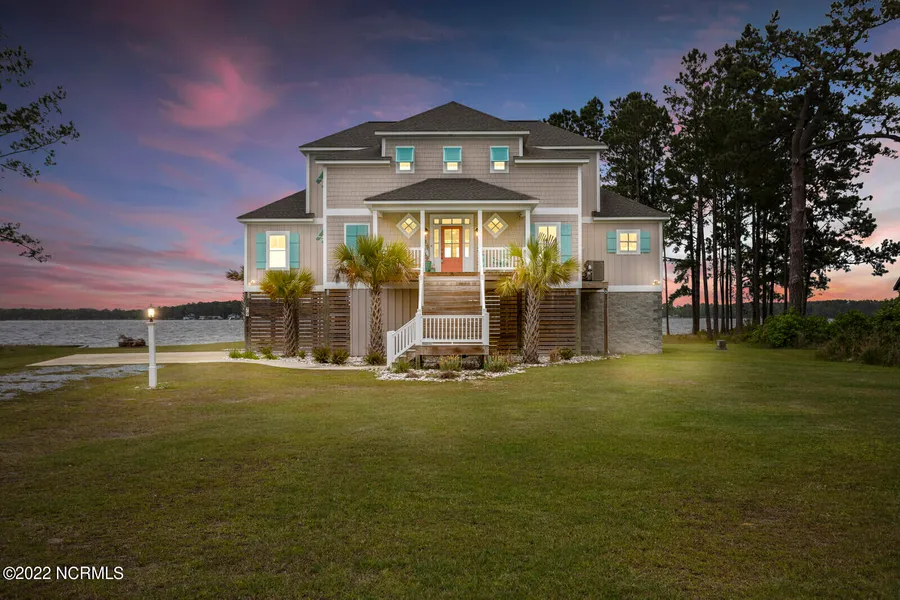 MUST SEE! Spectacular, custom designed coastal retreat with extensive views in mind! Watch the dolphins swim by from your private boat dock. Situated on a tranquil 1-acre waterfront lot on the Bay River, this stunning 3-bedroom 3.5-bathroom coastal cottage is everything you've been searching for and more. This immaculate home with incredible attention to detail throughout has never been rented and used exclusively as owners private vacation retreat. Home is professionally decorated and includes all appliances, furnishings and decor, and two Hobie Mirage kayaks for relaxing fun on the water. Just bring your toothbrush. As you make your way through the front door, you will be greeted by picturesque views from every window, a breathtaking stone fireplace, and quality craftsmanship that flows throughout the home from floor to ceiling. The beautiful chef-inspired kitchen boasts a large island, granite countertops, 6-burner BlueStar gas range, pot filler, porcelain farmhouse sink, ample cabinetry, and a walk-in pantry. The first-floor primary suite offers more breathtaking water views, and a sliding barn door that welcomes you into the en-suite accented with marble countertops and exquisite tiled shower and a walk-in closet with custom built-ins. The wide staircase takes you to the second floor where you will find amazing water views from every room, an open living area filled with tons of natural light, a full bath, and two additional bedrooms, one of which includes its own full en-suite bath. For outdoor enjoyment and convenience, this property features a conveniently located, Galaxy cargo lift with 1,000 lb capacity for easy transfer of groceries and supplies upstairs, covered concrete dock and boat house with a 10,000 lbs Tide Tamer boat lift with water and electric; as well as a kayak launch for easy access to kayaks without the need to get wet. The Bay River has excellent fishing and boating and is close to the ICW, Neuse and Pamlico Rivers and the Pamlico Sound.