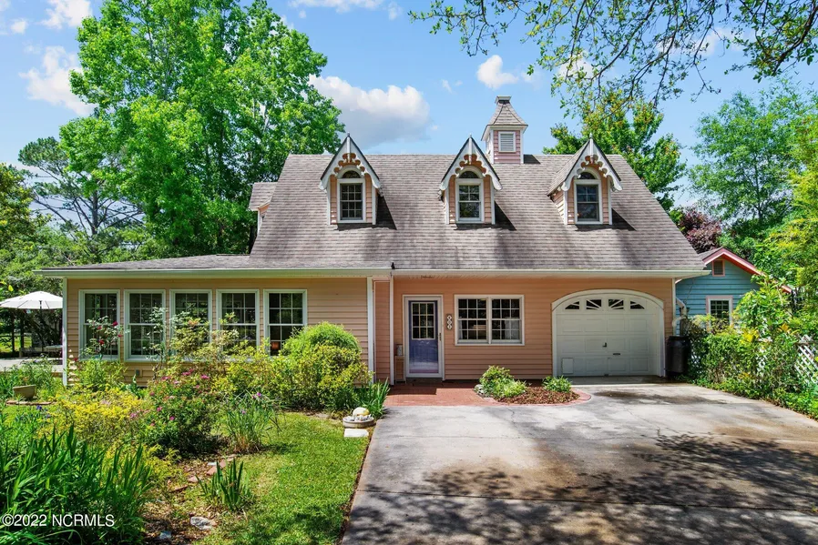 This 3-bedroom, 2-bathroom home, 1-car garage home is the perfect fairytale retreat. Located in the heart of the waterfront village of Oriental, this picturesque double-lot property is appointed with beautiful landscaping creating the perfect oasis for your primary residence or vacation getaway. Inside the home, you will find unique architecture and custom-built appointments throughout. The main living area includes a spacious, open living room with large windows and French doors while the dining area and kitchen are adjacent to the living area. The kitchen was fully renovated a few years ago with upgraded cabinets and granite countertops. There's also a guest bedroom and full bathroom on the main floor. Upstairs you will find an open loft/office area located between the second guest bedroom and primary owner's suite. The primary owner's suite includes a vaulted wooded shiplap ceiling and additional custom built-ins while the upstairs guest room has a beautiful built-in bed. Come fall in love with this exceptional home today before it's going, going, gone!