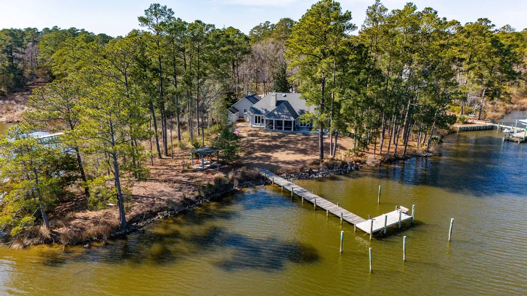 This exceptional 3-bedroom, 2-bath waterfront home captures the essence of coastal living. A stately, winding concrete driveway welcomes you, setting the tone for the elegance within. Inside, an open floor plan seamlessly connects the living and dining areas, centered around a cozy double-sided fireplace that adds warmth and ambiance to both the living room and master suite. The spacious kitchen is a chef's delight, featuring ample prep space, casual dining options, and an inviting eat-in area, perfect for family gatherings. The master suite serves as a private retreat with an en-suite bath for ultimate comfort. One of the three bedrooms is thoughtfully designed as a home office, complete with built-in bookshelves for a refined workspace. Additional highlights include a versatile hobby room, ready to inspire creativity, and a bright Carolina room that invites natural light, making it an ideal space for morning coffee or quiet relaxation. Outdoors, a detached two-car garage provides generous storage, while the well-manicured yard features a charming waterside pergola—perfect for unwinding in the gentle coastal breeze. Boating enthusiasts will appreciate the private dock, offering effortless access to the Neuse River and Intracoastal Waterway. Enjoy stunning water views from the screened porch or the expansive waterside deck. This elevated home sits on a private, serene homesite within a peaceful neighborhood, just minutes from local amenities, marinas, and the vibrant community of Oriental. Whether seeking a tranquil retreat or a home designed for active coastal living, 50 Windy Court offers the best of both worlds.