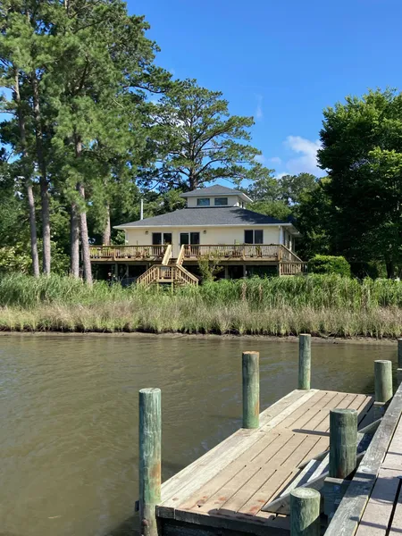 Perched on a beautifully elevated lot, this 3-bedroom, 2-bath waterfront home offers sweeping, unobstructed views of Broad Creek and effortless access to the Intracoastal Waterway with sailboat-depth waters right at your dock. Step inside to discover a thoughtfully updated interior designed for both comfort and style. The kitchen showcases sleek contemporary cabinetry, stainless steel appliances, a Fisher & Paykel double-drawer dishwasher, and durable luxury vinyl plank flooring—perfect for coastal living. Multiple Andersen sliding glass doors invite natural light and open seamlessly onto a spacious wrap-around deck, creating the ultimate indoor-outdoor living experience. The renovated bathroom features a beautifully tiled walk-in shower and heated tile floors—adding a touch of everyday luxury. Hardwood floors throughout much of the home add warmth and character, while the Vermont Castings wood-burning fireplace offers a cozy focal point for cool evenings. Additional highlights include: A 22 kW Generac whole-house generator for peace of mind A Kinetico water softener system for clean, conditioned water A new architectural shingle roof installed in 2019 A concrete dock and a boat lift less than six years old—ideal for your watercraft Expansive outdoor spaces perfect for entertaining, relaxing, and soaking in the views Whether you're an avid boater, a nature lover, or simply seeking a serene waterfront retreat, this property is a true gem that blends modern convenience with classic coastal charm.