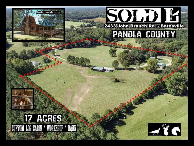 Welcome to John Branch Ranch, a picture-perfect horse property with a gorgeous log cabin ideally located between Batesville and Oxford. Features include a 40x50 insulated/ heated/cooled workshop with half bath, a 40x40 horse barn, two pastures, a round pen, and an amazing updated custom log home. The sellers have remodeled the cabin from top to bottom with unique features throughout the home. Not a fan of stairs? No problem --- this cabin has an in-home elevator that opens directly into the spacious master suite!
