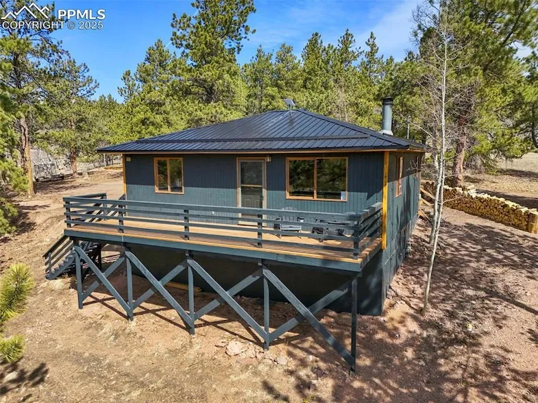 Tucked among towering pines and aspens, this peaceful Lake George retreat offers the perfect blend of rustic charm and modern comfort. Located just minutes from Eleven Mile Reservoir and Pike National Forest with access via county-maintained roads this cabin is a dream basecamp for outdoor enthusiasts. The freshly stained exterior and brand new metal roof add to the home s durability and mountain appeal, while new decking provides an ideal space to soak in the tranquil surroundings or host a summer cookout. Inside, beautiful new flooring flows throughout, paired with warm wood paneling that sets a cozy, nostalgic tone. Unwind in the inviting living room, where crisp mountain evenings are best spent by the glow of a wood-burning stove. The bright kitchen features ample cabinetry and counter space, and two sizable bedrooms share a full bath with built-in vanity storage. Step out back to a spacious deck with Pikes Peak views perfect for grilling, relaxing, or watching wildlife in the trees. The property includes a well, upgraded septic, on over 2 acres. Whether you're seeking a quiet weekend getaway or a private mountain hideout with convenient access to National Forest trails, 11 Mile Reservoir, Saddle Mountain, and 39 Mile Mountain, this cabin is a rare find in a truly serene setting.