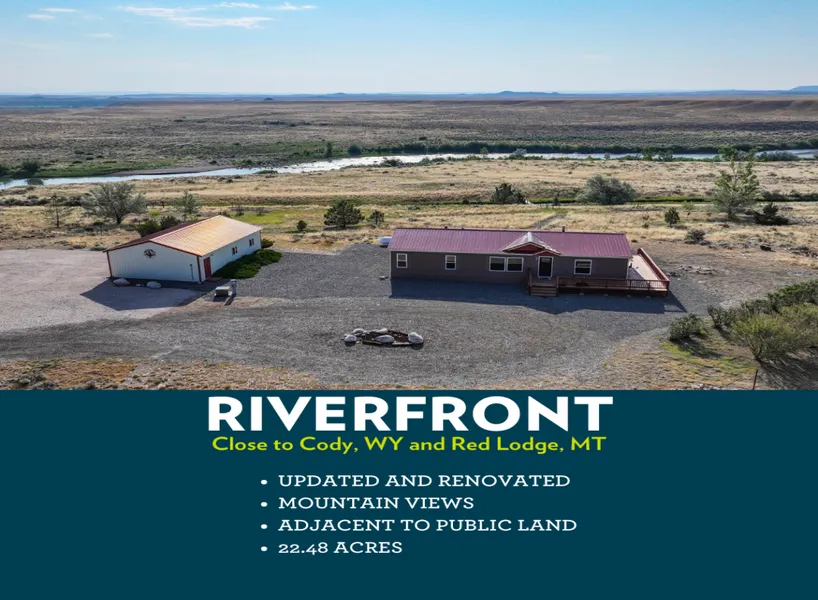 RIVERFRONT 22+ acres /house/garage/ building site on the Clark’s Fork Yellowstone staring at the Beartooth Mountains in scenic, quiet and NO INCOME TAX Clark, Wyoming. Close to Red Lodge and Cody, 800 ft of riverfront. Completely renovated manufactured home: new heat, a/c, flooring, toilets, moulding, well pump, exterior gravel, decking, paint inside and out, window treatments, vanities, shower, ALL appliances w/ 3 bed/2 bath, 2 living areas and wood stove. Walk in closets in all bedrooms and master suite. Fish on your own riverfront. Low maintenance with 2 car detached garage and premium building site on the river. Great primary home with space to build another home. Great rental. Surrounded by beautiful houses, acreage, BLM. No HOA, easy drive to Billings, Powell, Red Lodge and Cody. Well Flow Test in Documents. NOTE: 2023 property tax unavailable at this time due to Lot Line Adjustmen...
