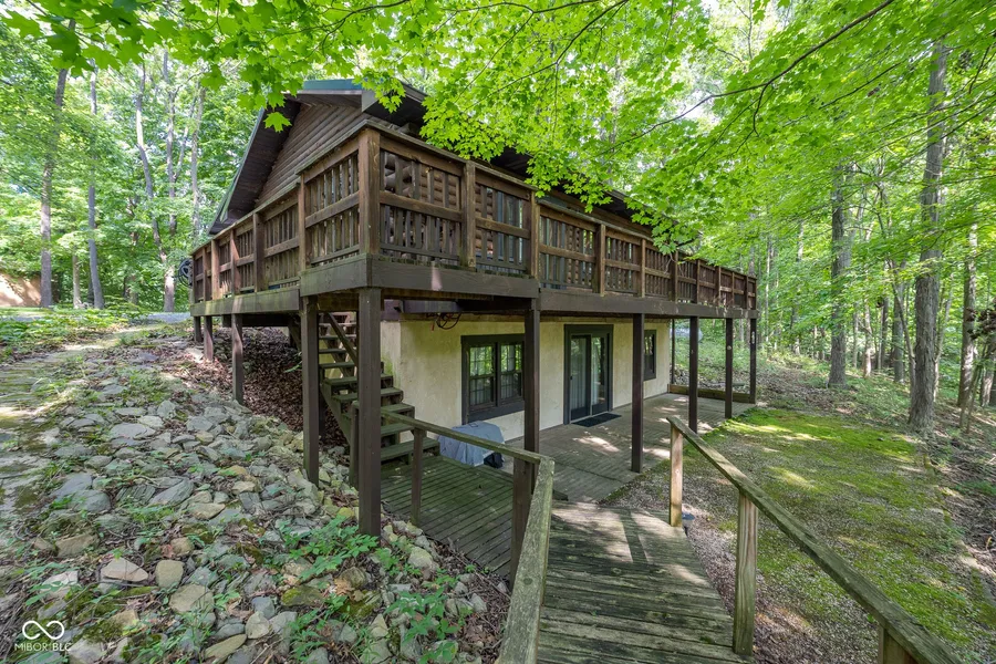 Nature lover's dream on a 5 acre pond! This 2 bedroom 2 bathroom log cabin is the perfect home for people who want to escape the hustle and bustle. Features include a wrap around deck, walk out basement with a waterfront view, large bonus room, utility room, covered front porch, dock, 2 car garage with a work shop, and it includes an adjacent .8 acre wooded lot. Although this property is not on Raccoon Lake, the community dock is within walking distance. Homeowners are selling this property As-Is and would like to include most of home's contents (including golf cart, lawn mower, small boat, and pickup truck). This secluded and idyllic property is a must-see. This listing includes two parcels (.37 acres and .8 acres totaling 1.17 acres).