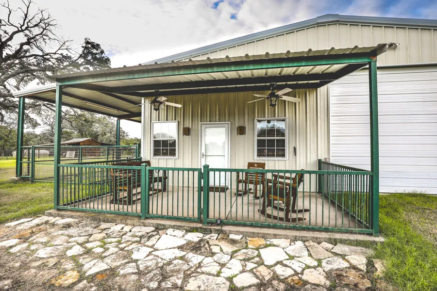 40x60 Barn with extra thick concrete slab to support heavy equipment. Living Quarters with R-30 Foam, Living room, dining, kitchen, large bedroom with two baths. Extras; One Paluxy well, another to Trinity, City sewer, Hay pens, separated pastures, live creek with pond, hybrid grasses, two small barns for equipment-shelter, pecan orchard with 13 trees and sprinkler system.
