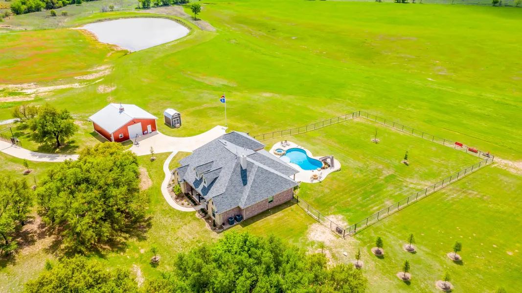 A rare offering of 54 gorgeous acres with exquisite custom home. As soon as you walk through the front door, the opulence of this home is evident. With today's modern Farmhouse feel, this family was inspired by the original farm house that was once part of their family's land. The open floor plan is highlighted by an expansive kitchen with custom cabinets and a massive island with remarkable granite. The living room has vaulted ceilings, walls of windows, and a handsome fireplace! Large master suite with luxurious spa like bath. Hardwood floors throughout. Impeccable attention to detail. Incredible sunset views to be enjoyed while lounging in the lavish pool that overlooks the lush hay meadow below! Incredible workshop with electricity and 2 roll up doors. Amazing location just 8.7 miles north of Downtown Weatherford!