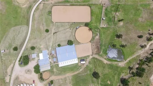 REAL PROPERTY: Turnkey 38.95ac Equine Training Facility. Adaptable for most all Disciplines. The property features 4 Arenas; 135' x 270' Outdoor Pipe Arena, 120' Round Arena, 95' x 120' Indoor Arena with 10 Stalls, 95' x 95' Round Arena, Breaking Pen, 6 Stall Show Barn, 10 Stall Stud Barn, 7 Stall Mare Barn with 2 Foaling Stalls, 2 Tack Rooms, Wash Rack, Breeding Stock, Restroom, Laundry Room, 4 stock Tanks, 7 Turn Out Pastures with Loafing Sheds and over 25 acres of Fertile Pasture. The 3 Bedroom, 2 Bath Brick Home has been recently updated with new kitchen appliances, lighting, granite counters, new carpet and updated bathrooms. For Ranchhands or Guests there's a Studio Bunkhouse with a Full Bath, a Single Wide Mobile Home and RV Hookups. There's approximately 1455' of road frontage on FM 3028. Enjoy the peace and quiet of country living, just minutes to to I-20, Weatherford and only 45 miles to Fort Worth and Will Rogers Coliseum.