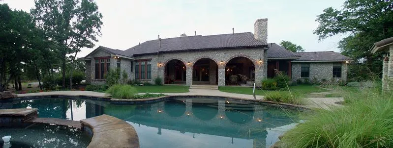 interior, stone accents, Oklahoma flagstone coping, scored concrete deck and stone hot tub. Pool house