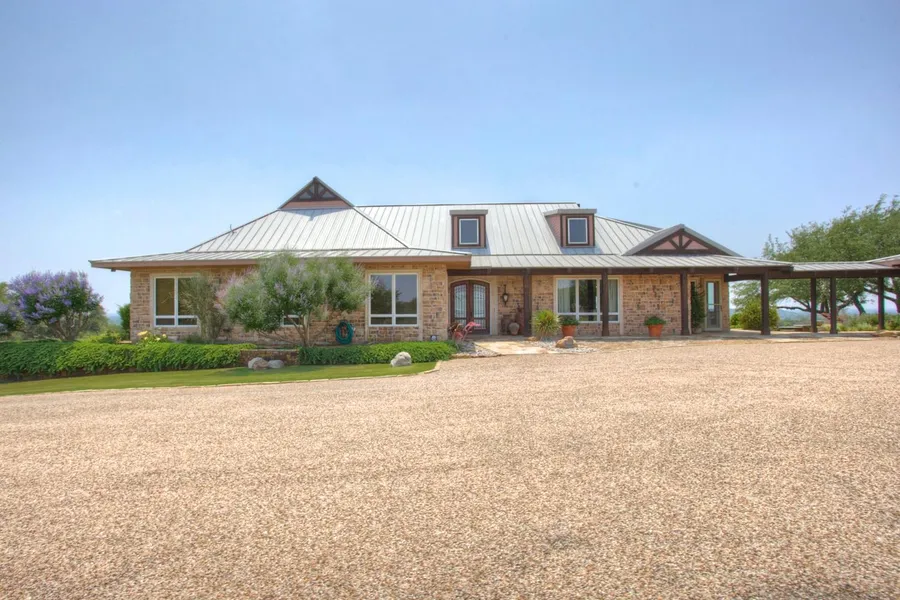 This prestigeous Hill Country style estate sits on over 13 acres in the elite Silverado on the Brazos. The main home exudes luxury with soft toned walls, rich woods are accented by the stone fireplace and stone columns. An extravagant gourmet kitchen with beautiful granite counters, allows one to host enormous gatherings that can flow out to the many inviting and lighted patios. A peaceful place to unwind while watching the sun set and the river valley below. The Master Suite includes a spa like luxury bath along with a private excercise room or perfect baby room. The guest suite is only a short distance away down the covered pathway. The property is fenced and cross-fenced into several paddocks perfect for your livestock along with a private gated entry. The 4 stall barn is complete with runs for easy turnout for your horses. There is a great storage/workshop area as well as a t...