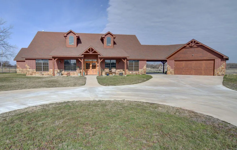 Gorgeous custom home on 19 plus acres. This home features over 3100 sq ft and a stone and brick exterior with a pass through porte-cochere connecting the 2 car garage. This home also has a beautiful wb fireplace in the large living area that is open to the kitchen and dining. The kitchen has custom cabinets and ss appliances. Mstr bdrm with carpet has adjoining bath with huge Jacuzzi tub, 2 separate vanities, huge tile shower and a large closet.