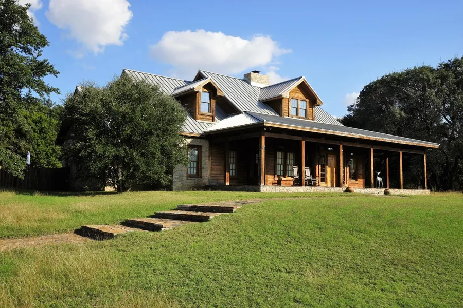 with a cedar & stone exterior. Office, half bath, feed & tack rooms, and equipment storage. A 2 bedroom