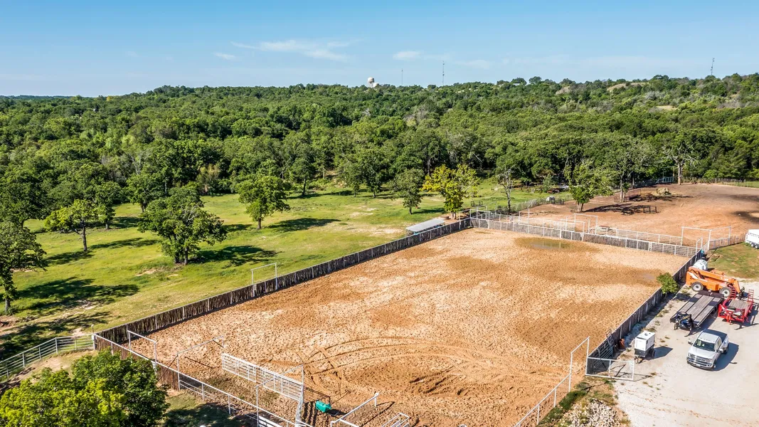 Enter into this EQUESTRIAN PARADISE through the covered bridge. Come see this 54 acres with an awesome custom built home that checks all the boxes, custom built cabinets and counter tops, all flooring is like new. Lying in the cutting horse capital of the world just 25 miles to Ft Worth, with an arena, 6 stall horse barn with turnouts and tack room and inside & outside wash areas. Office has 2 levels with with a bathroom and balcony overlooking the arena . The patio area is amazing. Bring your horses and livestock, or just relax in the peace and quiet of this country setting. Sit on the porch and enjoy the wildlife including deer and turkey from your hot tub or fish in the large tank. THIS IS A MUST SEE !