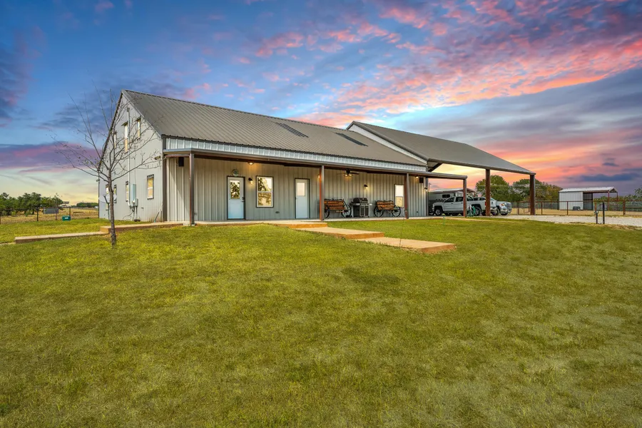This ag-exempt horse property next to famous Bosque Ranch features a 2-bedroom barndominium & an efficiency apartment upstairs. The main residence offers a kitchen with stainless steel appliances, laundry room & walk-in closet. The apartment is accessed from an exterior private entrance or the living room.