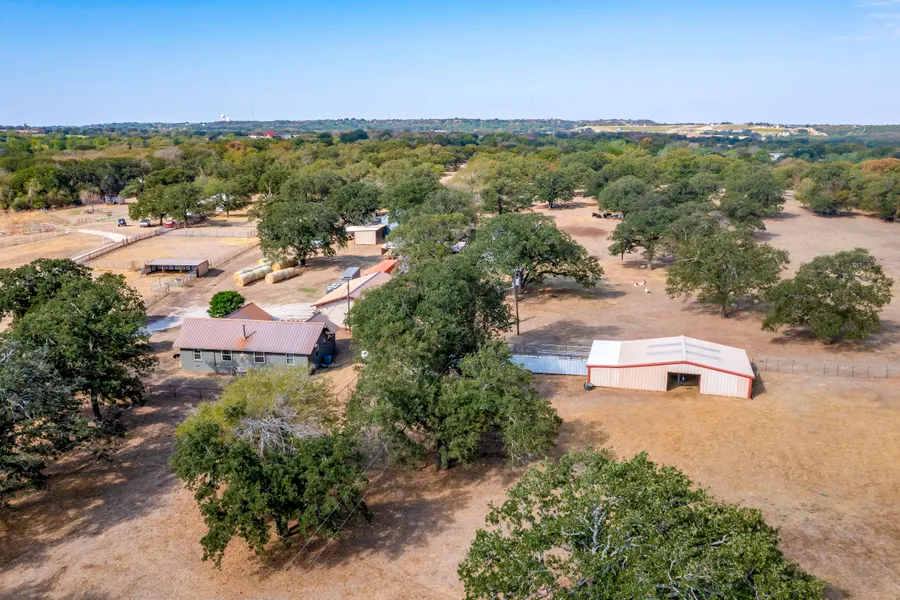 Nestled amidst the picturesque landscapes of North Parker County, this gorgeous 19 acres boasts stunning mature oak trees! Charming 2 bed 1.5 bath farmhouse. The heart of the home is a delightful kitchen featuring an expansive granite island & window flanked dining area. The spacious living is adorned with a wood stove, exuding warmth & comfort, & invites the outdoors in through French doors. The property is graced by a magnificent vintage horse barn with soaring rafters boasting 8 stalls, tack room, wash rack, & covered outdoor runs. A second barn offers 6 additional stalls. 4-bay garage. Insulated dog barn with kennels. For over 30yrs this versatile property was a premier facility for training some of the best Barrel Horses in the country, 3 world champions, & 2 top flight stallions. It currently serves as a thriving farm & a dog training facility, even accommodating dog boarding services. This property offers boundless opportunities for you to create the rural life you've always envisioned.