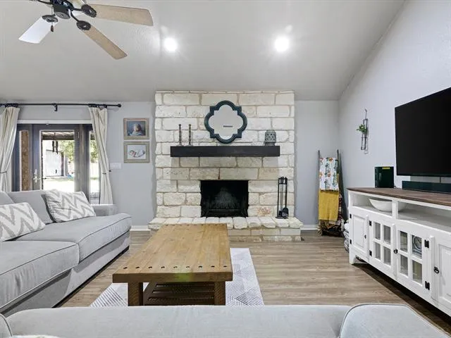 This lovely 3 bed, 2 bath home offers thoughtful updates, great flow, & space to spread out on 1.28acres! Close to shops, restaurants, HEB, & highway access! The charming covered front porch welcomes you & is the perfect spot for your big Welcome sign. The metal shop has room for your hobbies & extra storage. NO HOA. The family room offers vaulted ceilings, wood burning fireplace, & views of the covered back patio. 3 year old roof, 2 year old water heater, & added Nations Pure whole home water filtration system. New ceiling fans throughout. Single-level floorplan with matching laminate floors throughout, NO CARPET! Double pane low-E vinyl windows for added efficiency. The laundry room has been renovated to add ample pantry space with additional storage. The bedroom closets have custom closet systems & both baths offer double sinks. Enjoy the neighbor's horses or you could get your own! You don't want to miss this gem! Check out the interactive Matterport tour!