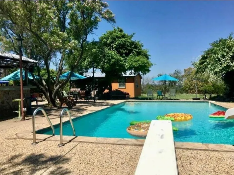 Make this your own private four acre entertaining paradise! Huge 12ft diving pool with serving bar, cabana, bunk house with full bathroom, firepit, and natural stone walkways. This wonderful home offers living space galore. Lovely kitchen with wood finishes. Huge master suite upstairs with a fireplace, walk in closet, great bath and large balcony. Good sized bedrooms downstairs with bathroom. Large native & peach trees. RV hook up, inground storm shelter. Amazing views. Room to roam for you and your animals. Make your appointment today!