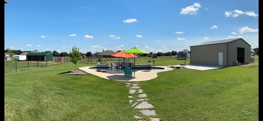 Feast your eyes on this stunning 4-bed, 3-bath, mini ranch majestically poised outside city limits. Country Charm Meets Modern Luxury. 1017 Llano promises comfort and convenience with raised ceilings, quartz countertops, ample storage throughout, and a sizeable guest room with a vaulted ceiling. Muddy shoes or wet feet? Both the utility room and Pool bath open to the exterior. No more tracking the mess through the home. The Jack and Jill secondary rooms add to its charm, along with a substantial Primary space to retreat to. Step outside and enjoy the peaceful evenings, gazing at our Texas Sunsets, on the patio or floating in the alluring 2023 Pinnacle Saltwater pool with stunning waterfalls and LED lighting system. Need more? This 2.23 acre property is crossed fenced, boasts a 30x30 shop with electricity and a drive-through feature and is complete with a 2-stall barn and tack room. smart home system, epoxy flooring in garage and solar screens panels.