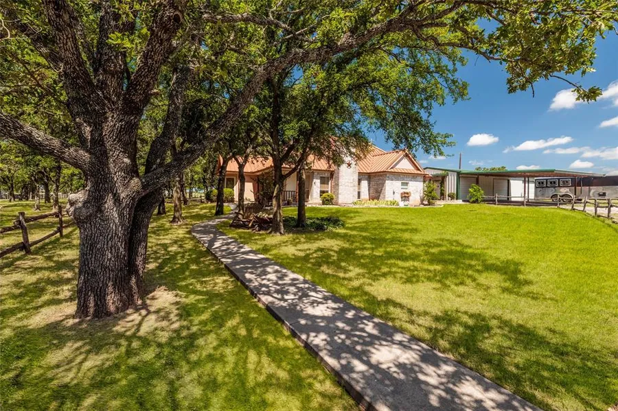 Live Your Dream and wake up in the morning to see your horses. Ride in your own 100 x 100 covered arena and enjoy the 4 stall barn with a tack and saddle area, wash rack and shed. Enjoy the 1+ acre stock pond for your animals and fishing. Gentle rolling hill, mature oak trees located on a quiet dead end road. Cement floor shop and a 4 car carport and 24 x 50 garage for cars and park your horse trailer or RV. fenced and cross fenced, 2 x 4 no climb and smooth wire for your horses, 4 pastures and 2 traps. The home is a delight with a copper colored metal roof, upgraded kitchen, gorgeous wood burning stone and hearth fireplace, 3 bedrooms and a great sunroom to enjoy at the end of a day. Vaulted ceiling in the kitchen and dining room. Only 2.5 miles from I-20 Brock Exit and ambulance station. 15 minutes to the historical Weatherford square, 60 minutes to DFW International Airport and 65 minutes to Love Field in Dallas. Welcome to Parker County, the Cutting Horse Capital of the World.
