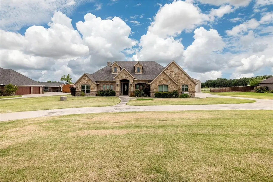 Welcome to this stunning custom-built single-story home on a large parcel with a detached 40 x 50ft RV garage.The open floor plan features gleaming wood floors, natural stone accents, and a wall of windows for abundant natural light.The spacious formal dining and music rooms flow into the main living area with a stone fireplace and built-in cabinetry.The chef's kitchen includes double oven, a gas cooktop, oversized pantry and a large prep island with granite countertops.Enjoy year-round entertaining on the screened-in back patio.The primary bedroom boasts a luxurious en suite with separate vanities, large tub, walk-in shower, plenty of counter space. The private craft room can be a 4th bedroom.Energy-efficient foam insulation ensures low utility costs.The yard features an orchard with many fruit trees, and the outbuilding has an oversized garage door, large separate storage room and 50 amp plug for RV parking. Don't miss this exceptional property! JH SR transfers approved for Brock ISD