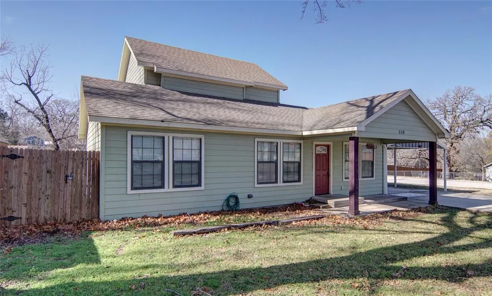 Don't miss out on this charming two-story home, featuring a private master retreat upstairs! The open-concept living area boasts luxury vinyl plank flooring throughout. The kitchen is a chef's dream with granite countertops, a spacious center island, and stainless steel appliances. Plus, enjoy the convenience of a separate laundry room. The thoughtful split-bedroom layout offers three bedrooms downstairs, perfect for guests or family, while your master suite enjoys complete privacy upstairs. Set on a large corner lot, the backyard is fully fenced for added privacy, screen in back porch, and there's a 12x20 workshop-storage building for plenty of extra storage. If you're looking for a home with character, charm, and privacy, yet still close to everything town has to offer, this is the one for you!