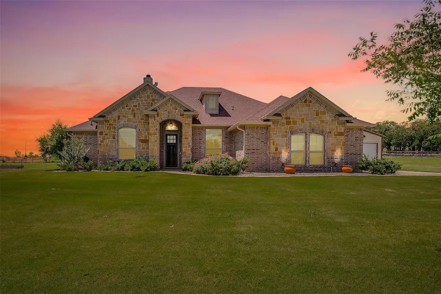 Listed on a one-acre lot in a quiet cul-de-sac, this home offers three bedrooms, with an optional fourth bedroom or office, three full bathrooms, and a versatile media or game room. The open-concept interior features spacious living, dining, and kitchen areas. The kitchen boasts a large island with an 18-inch overhang for a breakfast bar, granite countertops throughout, and ample storage. The split floor plan ensures privacy for the expansive primary suite. Large windows flood the home with natural light and offer stunning views of the backyard oasis. Outside, a covered patio is perfect for lounging and dining, overlooking a beautiful in-ground swimming pool and fire pit. The yard is enclosed with pipe fencing and no-climb wire. Mature landscaping enhances the property's charm, with by a side-entry two-car garage and a 14x20 shop with electricity. Discover your perfect blend of tranquility, comfort, and entertainment in this amazing property!