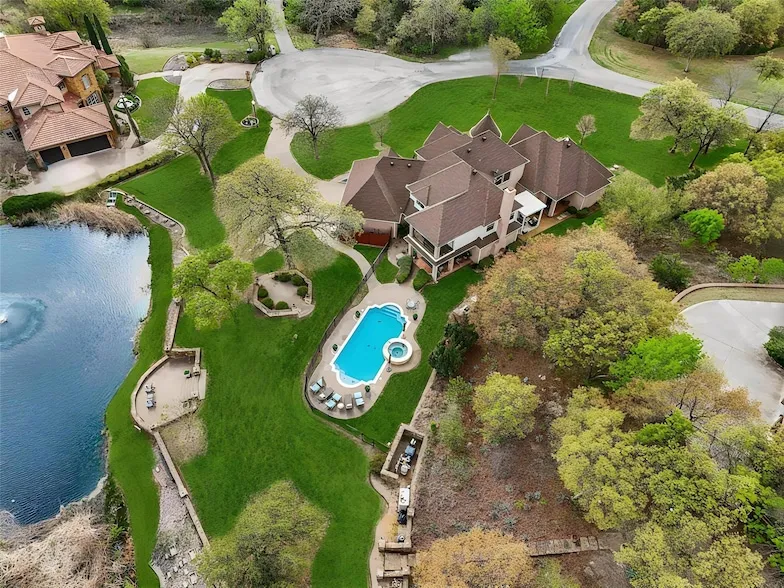 Discover an exceptional luxury residence nestled in a quiet cul-de-sac within the prestigious Covered Bridge Canyon community just 20 minutes from Downtown Fort Worth. Positioned on one of the most distinctive pond-front lots in the neighborhood, this meticulously updated 4,370 sqft home offers a rare combination of elegance, privacy, and sweeping views of rolling hills and tranquil water features. Designed with both comfort and sophistication in mind, the home features 4 spacious bedrooms and 5 bathrooms. At its heart is a showstopping gourmet kitchen, complete with Taj Mahal quartzite countertops, high-end appliances, newly painted cabinetry, and a large center island perfect for entertaining and everyday living. The living and dining areas are gracefully defined, offering a sense of intimacy while showcasing soaring ceilings, oversized windows with plantation shutters, and a seamless connection to the outdoor spaces. The primary suite serves as a private retreat, featuring direct access to a newly added pergola for peaceful moments outdoors. Its spa-inspired bath has been recently renovated to include a soaking tub, dual show heads, custom inset shaker-style cabinetry, and elegant gold hardware. The main outdoor living space features a covered patio, saltwater pool and spa, built-in grill, and professionally landscaped yard leading to flagstone patio overlooking the pond. This tranquil setting is ideal for quiet mornings or relaxed entertaining. Additional highlights include a whole-home generator with capacity to run the HVAC if power fails, nearly 400 sq. ft. of walk-in attic storage upstairs, and an extensive list of thoughtful upgrades throughout. Also a brand new roof will be installed May 2025. Located in the highly acclaimed Aledo ISD and surrounded by natural beauty, this one-of-a-kind property offers the perfect balance of upscale living and peaceful country charm all just minutes from city conveniences.