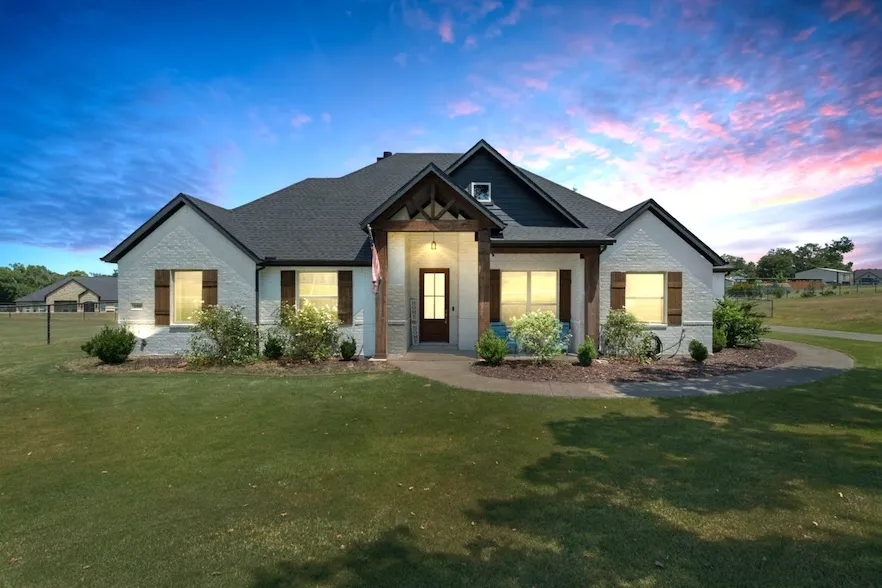 Country Charm Meets City Convenience!Welcome to this stunning 4-bedroom, 3-bathroom home with a dedicated office, perfectly situated on just over 1 fully fenced acre in a peaceful, no-HOA neighborhood. Offering the ideal balance of rural tranquility and city access, this home is just 20 minutes from downtown Fort Worth and 40 minutes to DFW Airport. Inside, you ll find an open-concept living and kitchen area featuring a vaulted ceiling with rich wood beams, beautiful wood-look tile flooring, elegant quartz countertops, a decorative backsplash, and stylish accent lighting over the kitchen island. The layout is both functional and spacious, offering three full bathrooms and an office, ideal for working from home or flexible use. Accent walls in the secondary bedrooms add a unique and custom touch.