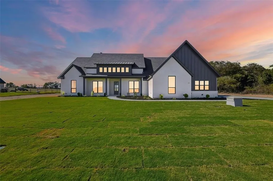Have you ever wondered what the perfect floor plan looks like? Look no further — this is it! Located in the highly sought-after Prairie Winds in Poolville, Texas, this stunning home sits on over 2 acres and offers just over 2,400 sq. ft. of beautifully designed living space. Featuring 4 bedrooms, a dedicated study, and 2.5 baths, this home truly has it all. Step inside and immediately notice the exceptional attention to detail throughout. The gourmet kitchen boasts quartz countertops, a double oven, and a cozy dining area perfect for family gatherings. The split-bedroom layout provides privacy, with the game room located on the secondary bedroom side of the home. Retreat to your luxurious primary suite, where cedar-beamed checkerboard ceilings and serene views of your property create the perfect escape. The spa-like primary bath includes dual sinks, a freestanding tub, a frameless glass shower, and a large walk-in closet with convenient access to the laundry room. The laundry room itself is thoughtfully designed with built-in cabinets and a utility sink. Enjoy outdoor living year-round on the expansive back patio, complete with its own fireplace and peaceful views of unobstructed farmland, along with abundant wildlife. With two fireplaces, a 3-car garage, and elegant finishes throughout, this home is truly a gem that combines comfort, functionality, and style.