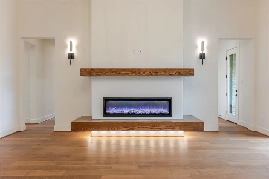 At the heart of the home is a chef-worthy kitchen featuring panel-ready appliances, a gas range, built-in ice maker, and a hidden walk-through butler’s pantry—all framed by clean lines and natural textures. The open concept living room showcases a stunning 60 in. linear fireplace with floating wood accents and under-lit hearth, creating a warm, modern focal point.