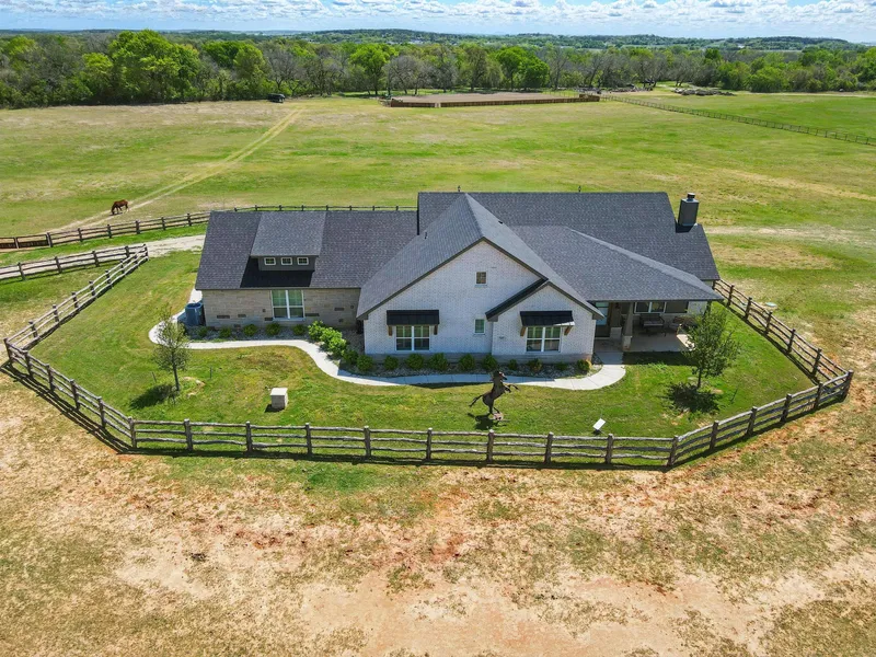 Stunning home situated on 15.4 acres in Brock Texas, this stunning 2,561 square foot custom-built home is nestled within the renowned Brock ISD. Only three years old, this home features a very open floor plan with large windows that overlook the lush coastal field, and it backs up to the serene Patrick Creek. With three bedrooms and two and a half baths, this open floor plan boasts beautiful hardwood throughout. Kitchen is open to the vaulted living room, lots of cabinets, large island, and high end appliances. The property is fully fenced and cross-fenced, with pipe rail fencing on the exterior and beautiful cedar fencing around the house. Enjoy outdoor living with a swimming pool and hot tube. Large shop featuring two glass roll-up doors, covered trailer storage, and four large stalls for horses. Stalls have auto waterers and premier stall feeders. New roping arena. Dont miss this oppo...