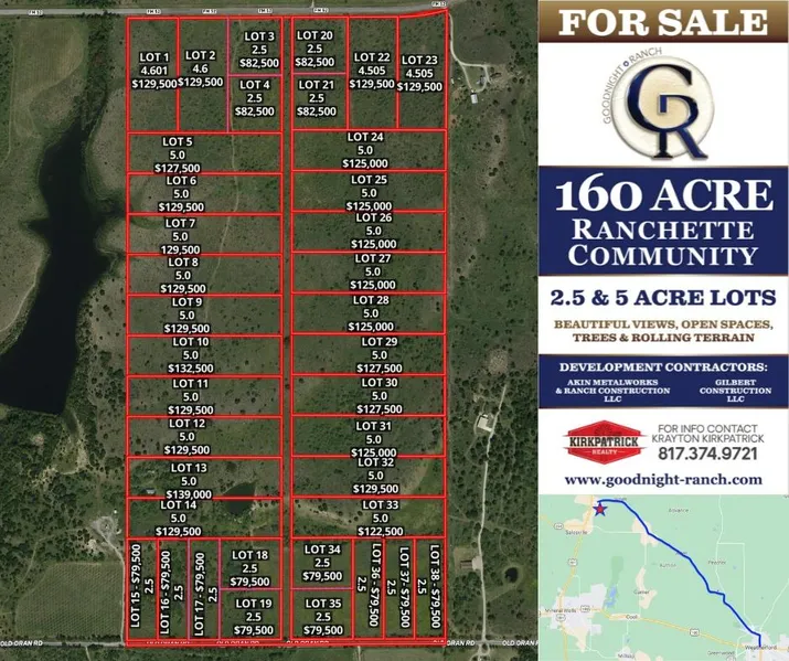 Own your own Ranchette on land that was once part of cattle baron, Charles Goodnights Ranch of the Goodnight Loving Trail. The Goodnight Ranch Development is offering Ranchettes of 5acs and 2.5acs. These gorgeous tracts offer rolling hills, mature trees, outstanding sunrise and sunset views. Bring the horses and build your own paradise within an hour drive to the metroplex. It's just a short skip to the booming town of Weatherford, or the Historical destination town of Mineral Wells and just minutes to one of the best lakes in the state known as Possum Kingdom Lake! No HOA.