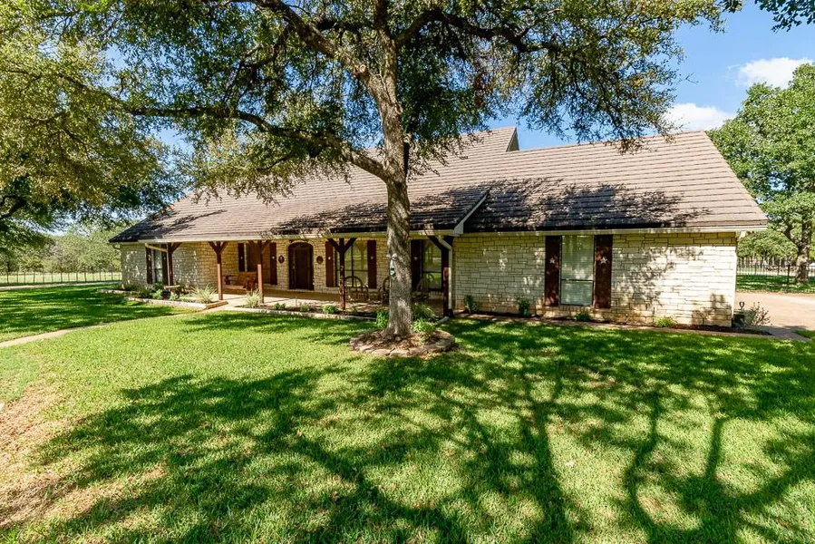Exterior: Stone-coated steel roof with guttering, complemented by brown shutters and front door. Living Area: Two-story vaulted ceiling, floor-to-ceiling Austin stone fireplace with pellet stove, built-in bookshelves and cabinets, large windows, and an atrium door opening to a covered back porch, pool, and yard. Flooring: Saltillo tile throughout, excluding the bedrooms. Kitchen: Equipped with tile countertops, backsplash, island, eating bar, abundant wood cabinetry, and white appliances (refrigerator, double oven, microwave, dishwasher, and trash compactor). Corner sink with dual windows overlooking the backyard. Breakfast Nook: Large windows with plantation shutters and a backyard-facing atrium door. Formal Dining Room: Spacious with large windows and a chandelier. Study/Office: Custom wood built-in cabinets, drawers, and shelving. Master Suite: Large windows with plantation shutters, ensuite bath featuring a jetted tub, walk-in shower, dual sink vanity, private toilet, and walk-in closet. Additional Bedrooms: Two guest bedrooms with fans and windows. Secondary Bath: Tile vanity, Saltillo tile flooring, and tub/shower combination. Laundry Room: Extensive cabinetry, tile countertops, and room for an additional refrigerator or freezer. Half Bath: Tile countertop and outside door access. Upper Level: Large, carpeted space suitable for a game room or additional study. Garage: Three-car capacity with two electric doors, a storm safe room, and custom-finished flooring. Backyard: Covered porch, swimming pool with jacuzzi, flagstone coping, and aggregate decking. The pool is equipped with a propane heater. A large, fenced yard and landscaped front yard enhance the propertys curb appeal. Modular Home: 2004 doublewide with 2 bedrooms, 2 baths, spacious kitchen and family rooms, and all-electric systems. Includes stove, refrigerator, washer, and dryer. Recent upgrades include plank tile flooring throughout. Covered decks at each entrance and a stone-coated steel roof. Additional Structures: Steel Garage - Contains a 3,000-gallon water storage tank used for the main residences sprinkler system, replenished by a private well and coop water. Horse Barn: All-steel construction with 5 stalls, runs, 1-1 efficiency apartment (includes refrigerator), workshop, and laundry room with washer and dryer. Concrete alleyway. Other Improvements: 150-foot cedar stave round pen, two loafing sheds, and a pipe and cedar stave entrance with a private gate and landscaping.