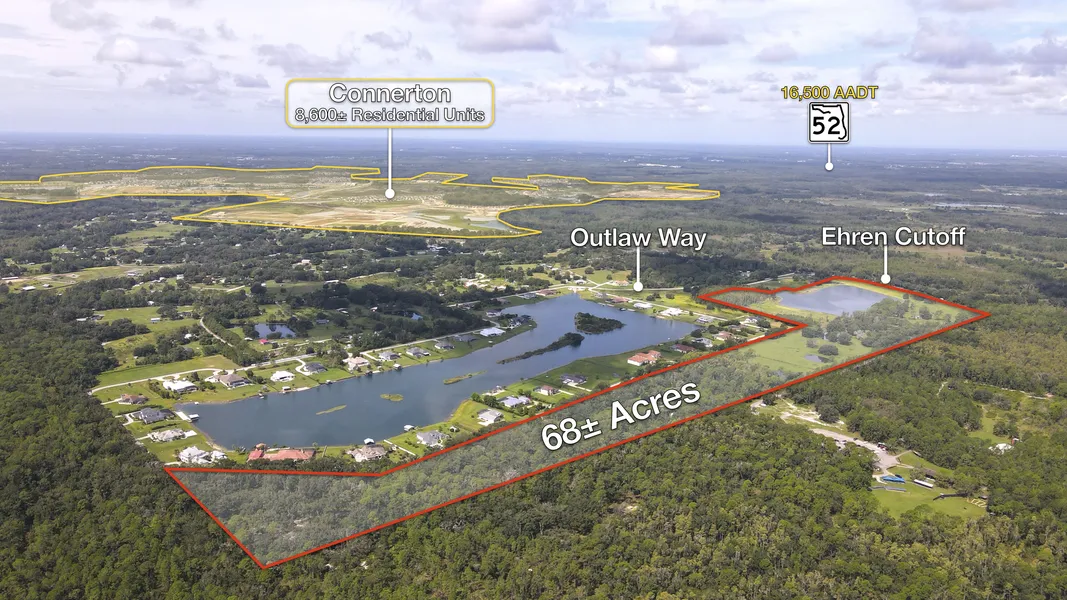 The subject property is located at 10460 Ehren Cutoff in Land O' Lakes in Pasco County. It's situated just south of State Road 52 and northeast of US Highway 41. It's across the street from the Conner Preserve and is adjacent to Cypress Creek Preserve and Tampa Bay Sporting Clays and Outlaw Ridge.