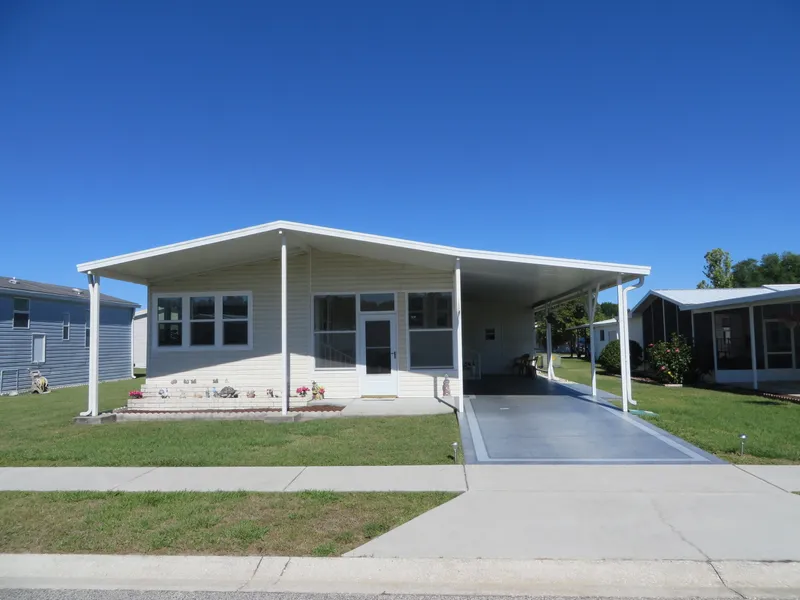 This 2 bedroom, 2 bath furnished double-wide mobile home would make a nice winter getaway from the cold north or year-round residence. As you enter the home you have your kitchen to the left and dining room to the right that leads to your spacious living room with vaulted ceiling. This leads to your Florida room for added living space which also gives you access to your screen room to enjoy when the weather permits. The master bedroom has an en-suite bathroom with a shower. On the outside you have your large storage room at the end of carport that also houses the washer and dryer. The roof was replaced in 2010 and the air conditioner in 2013 per the seller. One added bonus of this home is that it has all double pane windows except in the screen room. This home is located in Terrace Park, a registered 55+ community that has a clubhouse, pool, and shuffleboard with a variety of activities ...