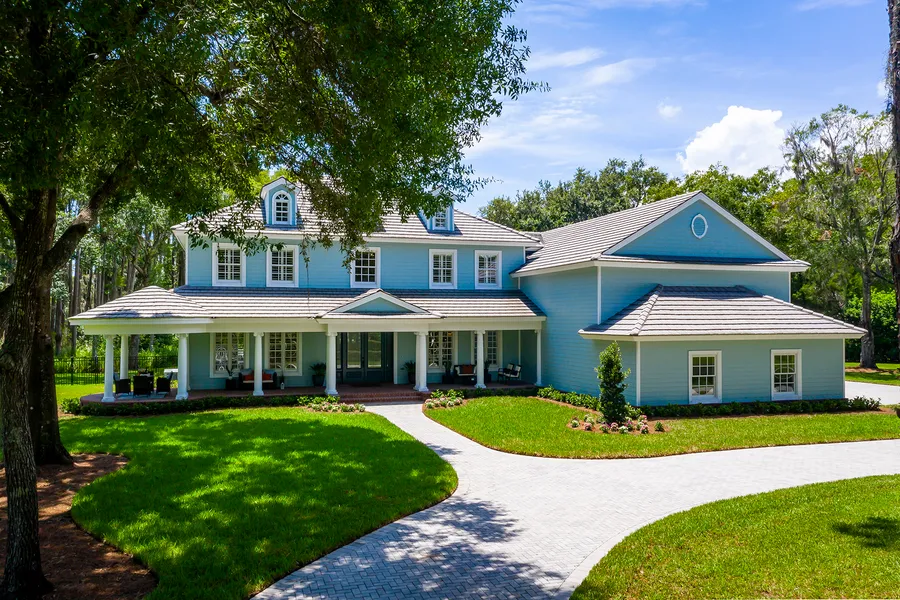 Perfectly placed on 4.8 acres of lushly landscaped grounds, this stunning southern living-style residence blends charm, elegance and modern finishes into an expansive five-bedroom, four-and-a-half-bath, 7,260 square-foot floor plan. Its covered front porch welcomes conversation and casual meals in a picturesque setting. Light-filled and brimming with character, fine features include dark Brazilian hardwood floors, crown molding and solid core and French doors. The gourmet kitchen with double islands, custom two-toned cabinetry and gorgeous quartzite countertops boasts a Sub-Zero refrigerator and professional freezer, Miele coffee center and wine bar with cooler, as well as an eight-burner Wolf gas cooktop and double ovens. The spacious master suite offers a remarkable retreat, a custom closet with a center island and a bath that showcases superb finishes, including porcelain plank flooring, a soaking tub, a walk-in shower and dual vanities. A second master suite is located on the first floor, offering the perfect in-law or guest space with its 10-by-11-foot sitting area and French doors overlooking the pool and grounds. The home is primed for entertaining with two spacious bonus rooms and a game room. The game room could be converted into a fifth bedroom if needed. The outdoor area is an outstanding oasis with a 38-foot custom saltwater pool, sun shelf and spa and a travertine paver lanai with covered space and an additional 16-by-16 pool-side pavilion that is ideal for hosting family and friends. Other appointments include an elevator, fireplace, prewiring for smart home technology, plantation shutters, central vacuum, water filtration system and a spacious laundry room with storage, hang-drying bar and laundry chute from the second floor. Other exterior features include a brick-paved circle drive, abundant landscaping and an oversized four-car garage. Serenity abounds with access to a scenic 10-acre fishing lake, and this pristine property provides an exceptional escape.