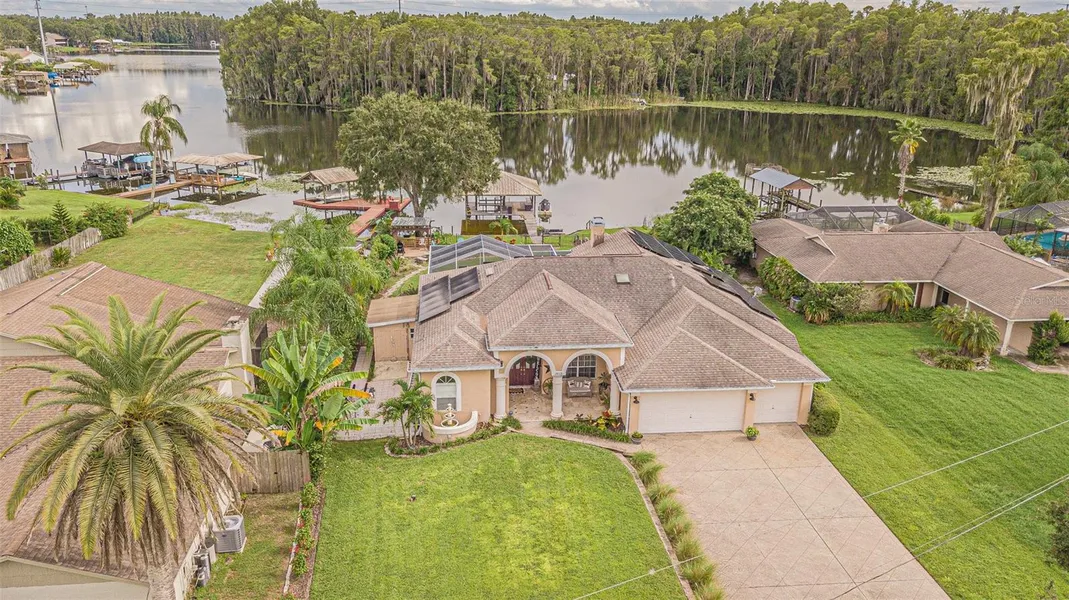 Magnificent home with deluxe waterfront living - Lake Padgett Estates is popular for 3 ski-size lakes & 1 fishing lake with parks, playgrounds & boat ramps. Horse stables, tennis courts, basketball, volleyball, too. Double-door entry to living room / dining room. Open floor plan: kitchen & family room with wood-burning fireplace. Kitchen with modern wood double, lit cabinets up to the 10-foot ceiling, granite counter tops, large island, and stainless-steel appliances. Master bedroom with double glass doors overlooking pool & lake & 2 walk-in closets. Master bath is one-of-a-kind with 10-foot arches, frameless glass & rain shower, garden tub, & double sinks. Recessed LED lights throughout home. Split bedroom layout. Travertine flooring throughout the entire house. Convenient Cabana bathroom accessible from pool area. Covered patio extends to screened & pavered pool area. Patio boasts sink with cabinet & granite counter for entertaining. From pool, take artistic stone path through designer-landscaped flower garden going to pergola & covered dock. Enjoy the breeze while watching the water skiers & boat parade in December. Garage has custom-ordered closets & work bench. Driveway can accommodate up to 6 cars. NO required HOA, Flood Insurance, or CDD. Located close to I-75, Veterans Parkway, shopping, and dining. Buy this home and invest in a vacation lifestyle!