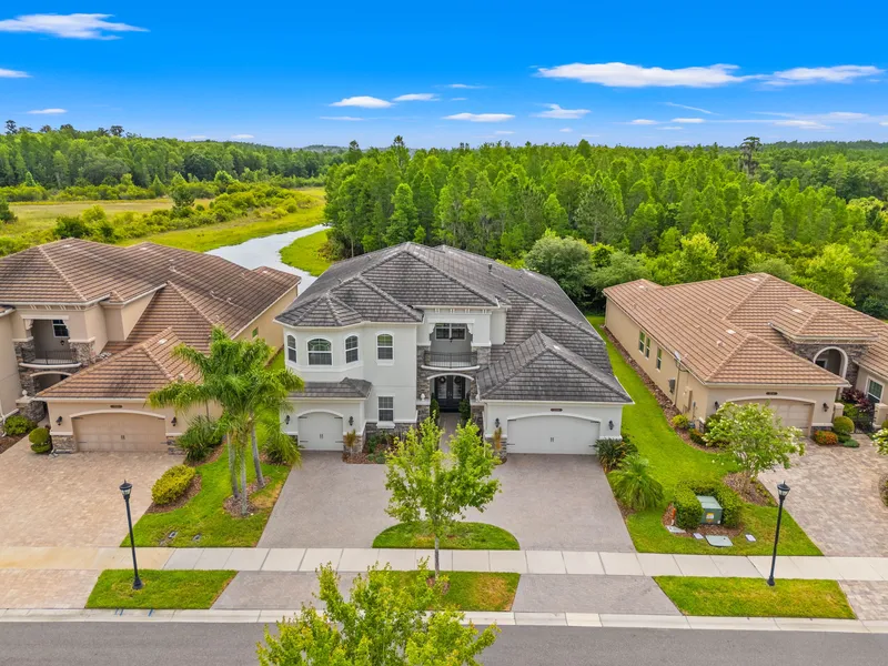 Your new home awaits your arrival in the exclusively gated maintenance-free community of The Ridge at Wiregrass. This beautiful home was built in 2017 & consists of a meticulously designed floor plan featuring a downstairs master, 2nd bedroom with an ensuite on the first floor, 2 additional bedrooms upstairs, a library or office downstairs, a dining room, and a media room. The offerings of this settlement do not end here, as you will enter on the circular paver driveway & experience the gorgeous landscaping in the front or pull into the spacious 3-car split garage complete with a 220-volt outlet. This fairy-tale-esque home boasts a Romeo & Juliet balcony in the front and continues to impress with a grand entrance with 21 ft ceilings. With natural light shining through the bounties of windows into the open floor plan, a sense of vibrance & openness is present. The family room, located in the center of the home, includes a gas fireplace with sliders leading out to the salt water/heated pool. Embrace Florida’s vivid greens with a stunning view of nature by the pond from the screened-in pool area. While enjoying these sights from the private comfort of your home, you may have to share them with the ducks that tend to come around the back. Back inside the home lies the casual dining-off the kitchen overlooking this view & a formal dining room connected to the other side. The stainless-steel double wall ovens, natural gas cooktop and quartz countertop invite aspiring chefs to an ideal workplace. An abundance of cabinets allows for prime storage & an island provides additional countertop space for any cooking needs. Moving into the primary bedroom, you will encounter spectacular features such as custom-built walk-in closets & coffered ceilings, with windows offering a view of the idyllic scenery. The primary bathroom is spacious with two separate sinks, a vanity, a soaking tub, a bidet, and a recently updated shower with gorgeous marble composing a bench & wall niche inside. Head upstairs using the semi-spiraled staircase leading to an overlook of the downstairs. This stately touch gives a sense of openness & invitation to the home, which continues as you enter the two expansive bedrooms upstairs. The first bedroom contains an ensuite bath, while the other holds a commodious walk-in closet and a bathroom shared with the bonus/media room. As the home itself offers everything you need & more, do not underestimate the opportunities lying outside of these walls. The Ridge at Wiregrass provides a multitude of amenities such as the clubhouse, a game room, and a fully equipped fitness center. This advanced community continues to impress with a covered patio that overlooks the resort style pool. To live like you are on vacation, embrace the beach entry to the pool area containing a water slide, fire pit, wet play activity center, and lap pool. The four lighted clay tennis courts, full basketball court, and beach volleyball court allow for sports play without leaving the neighborhood and the open play field, shaded tot lot, and party pavilion present the perfect scene for social gatherings and fun. Upon leaving The Ridge at Wiregrass Ranch, you will be surrounded by plenty of shopping restaurants, and other necessities, with places such as Wiregrass Mall, AdventHealth Center Ice, BayCare Hospital, Advent Wesley Chapel Hospital, I75 and I275 highways, and several A-rated schools nearby. Enjoy the community of your dreams and return to the home of your dreams when the day is done!