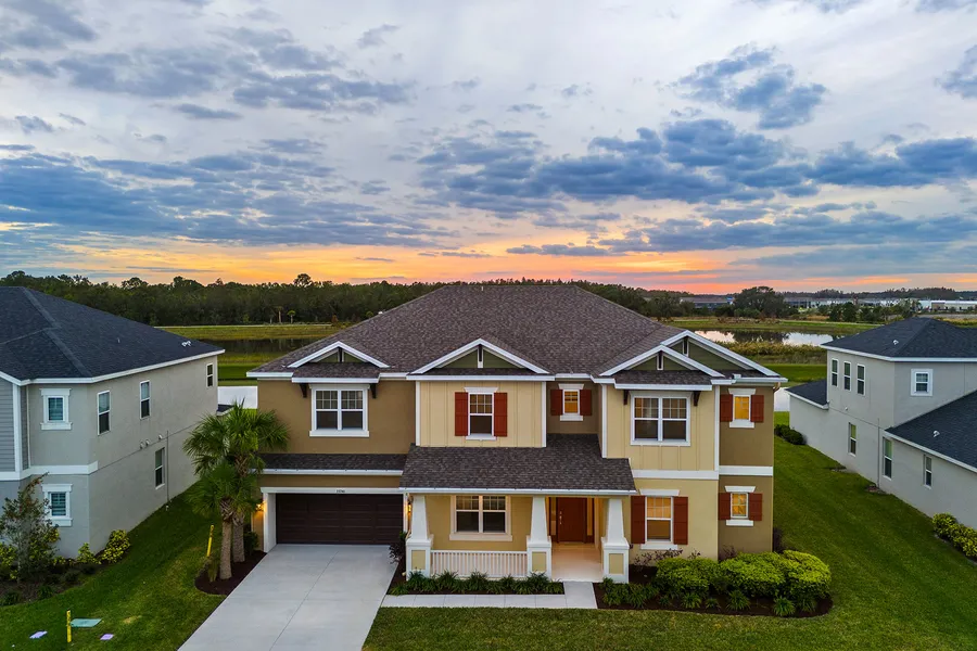 Presenting this stunning six-bedroom, 3.5-bath, three-car garage residence in the gated River Landing community of Wesley Chapel that offers luxury and privacy with breathtaking southwestern views over a tranquil pond. This 2022 Taylor Morrison Bimini floor plan features a grand two-story foyer and living room welcoming you with rich wood-style porcelain tile plank flooring flowing throughout. The spacious floor plan also includes a private office, formal dining room, bonus loft space, and separate movie theater/media room for enjoyment. The chef's kitchen boasts two expansive islands, including one dedicated prep sink and disposal. Enjoy high-end features like a touchless faucet, pendant lights, a gas cooktop with a ventilation hood and dual built-in convection ovens. A large stainless steel farmhouse sink, GE Profile appliances including a refrigerator with a beverage drawer, a kitchen reverse osmosis system, a butler's pantry with overhead glass display cabinets, and a step-in storeroom adds an elegant touch as a pass-through from kitchen to dining room. Retreat to the primary bedroom with its pond views, and spa-like en-suite bath featuring dual vanities, a makeup counter, deep soaking tub, frameless glass shower, plus dual walk-in closets with custom built-outs providing ample storage. The large covered rear patio includes pre-plumbing for a future outdoor kitchen, and the space is completed with two ceiling fans offering extended living space with amazing panoramic water and sunset views. A covered front porch also enhances curb appeal and provides extra place to rest and relax. Additional key features include no rear neighbors, over a quarter-acre lot, tray ceilings, 8-foot doorways, large laundry room, rain gutters, irrigation system, exterior lighting, a gas tankless water heater, dual-zoned air conditioner, natural gas hookup for an outdoor kitchen and dryer, a water softener system and a built-out spandrel closet. In the expanding Wesley Chapel, River Landing is host to first class amenities including a clubhouse, resort-style pool and hot tub, fitness center, playground, dog park, soccer field, basketball court, tennis and pickleball courts, and peaceful recreational trails. Nearby is access to many shopping, dining and entertainment options including The Shops at Wiregrass, Cooper's Hawk Winery & Restaurant, Tampa Premium Outlets, and ideally close to major roadways making travel to Tampa and the Tampa International Airport convenient.