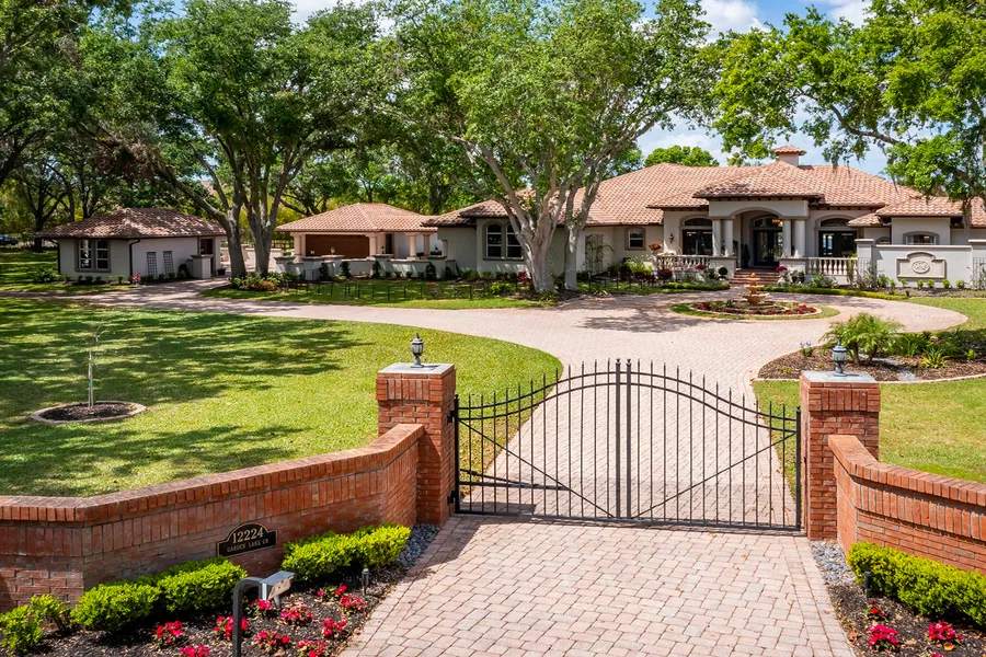 This magnificent 5,304-square-foot, one-story residence offers a resort lifestyle in a prime lakeside location. On three acres, with 180 feet of skiable Lake Breckenridge shoreline, the property boasts privacy and breathtaking views. Upon entering the gated entrance, you're greeted by a spacious brick-paved circular driveway. Inside, the home impresses with its elegant details including crown molding, coffered ceilings with wood inlays and 12-14-foot ceilings. The formal living areas feature custom wall niches, full surround sound and stunning lake views. The chef's dream kitchen comes equipped with beautiful cabinetry, an oversized island, granite countertops, two dishwashers, a double-oven Wolf gas range, a Decor built-in wall oven and a butler's pantry. The spacious family room is warm and inviting with a stone fireplace, attractive wall niches and 10-foot sliders that offer stunning views and plentiful light. Placed next to the family room is the deluxe media/billiards room, complete with immersive surround sound and a stunning wet bar. The handsome wood bar features a beverage refrigerator and ice maker for easy entertaining. Equally well-appointed is the home office, which focuses on creating a haven for productivity with a custom-built, wood-paneled desk and shelves. The primary bedroom suite is a spacious refuge. Its large closet combines style and elegance with bespoke built-ins, lighted shelving, thoughtfully designed shoe and accessory racks, and quality finishes. The en-suite bath's generous proportions provide ample space for functionality and aesthetic appeal, creating an oasis of relaxation with its jetted tub, dual vanities and separate commode rooms. The walk-in shower, complete with dual showerheads and massage sprays, offers a spa-like experience. Adjacent to the suite is another bedroom with lake views that's ideal as a nursery, studio or home gym. Beyond the house, the property boasts an expansive lanai with a resort-style pool complete with automatic multi-colored fiber-optic lighting. Gas-powered tiki torches and a lakeside fire pit with comfortable seating combine to create a relaxing ambiance. Together, the outdoor wet bar and top-of-the-line summer kitchen with a Viking grill, warming drawer, cocktail station and refrigerator provide a setting for outdoor entertaining. Designed for the RV enthusiast, a spacious 48-foot storage barn ensures your vehicle is secure and protected and comes equipped with 50-amp electrical service, cable connectivity, water hookups and a pump station. The three garages, two two-car and one single-car that's air-conditioned, are well outfitted for car enthusiasts and wrap around a spacious motor court. Meticulously designed landscape lighting transforms the property into a luminous oasis at twilight. The 100-square-foot greenhouse comes equipped with water and electric, and provides essential elements for cultivating a diverse array of plants year-round. If you need a guest house or in-law suite, this beautiful three-acre wooded setting provides ample space for a charming, lakeside casita. Additional features include a whole-house generator with a 1,000-gallon propane tank that can keep the house running for two weeks. This unique combination of luxurious amenities, stunning lake views and copious outdoor entertaining spaces makes this estate an ideal retreat for discerning buyers.