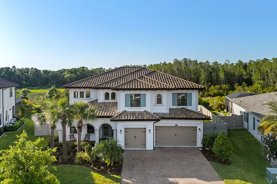 Elegant living awaits in this exceptional five-bedroom, five-bath residence within gated Estancia. Enter a grand entry boasting soaring 21-foot ceilings, setting the tone for the sophisticated design found throughout. With a superior floor plan, this home features above and beyond details of brick accent walls, wrought iron banisters, tray and coffered ceilings, oversized baseboards, crown molding, 8-foot interior doors, and beautiful floors complimenting all of it. The gourmet kitchen is a chef's dream, showcasing a large quartz island with a farmhouse sink and pendant lights, a built-in gas cooktop, microwave, and dual convection ovens, along with GE Café stainless steel appliances including a dishwasher, refrigerator and range hood. Soft-close drawers, a built-out walk-in pantry, glass display cabinetry with built-in lighting, and a stone and white brick backsplash complete this culinary space, which also includes a spacious dinette with views of the pool. The living room is the focal point of the main level offering a built-in entertainment center with an electric fireplace while opening to the dining room displaying custom shelving. Downstairs also features an excellent office space with glass French doors, and a generous sized bedroom and bath that is great for in laws or guests. Entertain upstairs in the bonus media room, complete with a beautiful wet bar featuring dual bar refrigerators, balcony access through large sliding glass doors and striking red brick feature walls. Retreat to the primary bedroom with balcony access, a double tray ceiling with stunning wood beam, crown molding, wainscoting, and an impressive walk-in closet located in the en-suite bath. The primary bath is a luxurious oasis with an oversized frameless glass shower featuring dual shower heads and a rainfall shower, a built-in deep soaking tub, a split dual vanity with framed mirrors, a separate water closet and a large double-door linen closet. The outdoor space is an entertainer's paradise with a heated, saltwater pool and spa, a tanning ledge with fountains, pencil jets, and fire/waterfall bowls. Motorized privacy screens enclose the sides of the pool cage, while an outdoor kitchen with a sink, bar refrigerator and grill, a retractable awning above the outdoor covered bar seating, and lighting provide the ultimate outdoor experience. In the Estancia community offering resort-style amenities including pickleball, tennis and basketball courts in addition to a community fitness center, clubhouse and heated pool with slide, as well as miles of scenic trails, parks and playgrounds. Centrally positioned in the heart of Wesley Chapel near multiple hospitals, dining, shopping, as well as in the top-rated Wiregrass School districts.