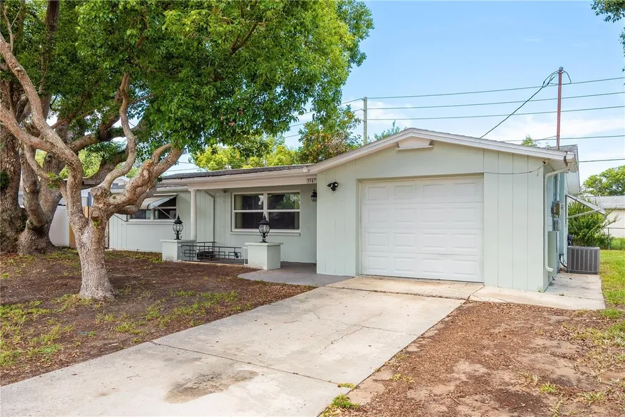 Brand new AC! This 2-bedroom, 1.5-bathroom home features a welcoming exterior with a large, shaded front yard, a front porch with decorative lighting, fresh exterior paint, and updated windows. A one-car garage adds both convenience and functionality.