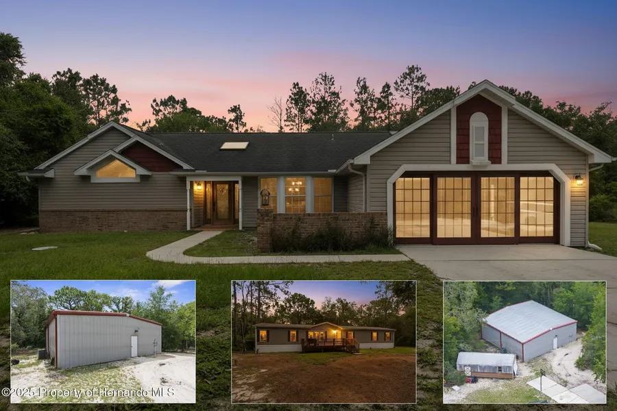 PRIVATE 5-ACRE MULTI-FAMILY COMPOUND WITH POOL, COMMERCIAL-GRADE WORKSHOP & HORSE-FRIENDLY ZONING! This rare multi-generational property offers TWO SEPARATE PARCELS totaling 5 ACRES in a PRIVATE & SECLUDED setting on the Pasco/Hernando County line, just minutes from the Suncoast Parkway for an easy commute. With NO HOA, this fully fenced estate with ELECTRIC GATE is ideal for horses, livestock, and COUNTRY LIVING while keeping modern conveniences close by. This 4-acre parcel features a beautifully maintained main residence offering 3 BEDROOMS 3 BATHROOMS PLUS FLEX ROOM/ 4th BEDROOM with original SOLID OAK TRIM and SOLID OAK DOORS throughout, SOLID OAK FRENCH DOORS with BUILT IN BLINDS, and gorgeous REAL HARDWOOD FLOORS. The newly renovated kitchen offers GRANITE countertops, abundant cabinetry and counter space, a DOUBLE OVEN, custom recessed lighting, and a brick terra-cotta tile floor and a breakfast bar overlooking a cozy family room featuring a WOOD BURNING BRICK FIREPLACE with a hearty oak mantle. The living spaces are filled with NATURAL LIGHT from both Bay windows and dramatic SKYLIGHTS in the FORMAL LIVING ROOM, FORMAL DINING ROOM and BREAKFAST NOOK, which leads out to the SCREENED POOL and LANAI. The spacious primary suite includes an ON- SUITE perfect for a HOME OFFICE/FLEX SPACE and a SPA LIKE BATHROOM with DUAL VANITY, GRANITE COUNTERS, a GARDEN TUB, separate shower, and private water closet. Additional features include a LARGE LAUNDRY ROOM/MUD ROOM with a window, and a TANKLESS HOT WATER HEATER. The garage was converted to a FLEX ROOM/4th BEDROOM with a stunning wall of OAK FRENCH DOORS with built-in blinds to match the others throughout. The SCREENED LANAI overlooks the serene acreage and offers multiple seating areas for entertaining or relaxing. The detached 40x40 RED IRON NUCOR STEEL FULLY INSULATED COMMERCIAL GRADE WAREHOUSE, is complete with its own 200 AMP electrical panel with plenty of room for additional circuit breakers, 2.5-ton HVAC, ceiling fans, lighting, and enclosed room. Perfect for tradesmen, mechanics, woodworking, or a business, it includes hardware to convert the entry to a garage door if desired. A large, detached shed provides additional storage. THIS IS A MULTI-PARCEL SALE including the 1 ACRE parcel - 5BR/3BA Manufactured Home built in 2019 which offers 2,128 square feet featuring an OPEN FLOOR PLAN, large kitchen with KITCHEN ISLAND, spacious LAUNDRY ROOM/MUDROOM/STORAGE ROOM. The primary suite includes a GARDEN TUB, DUAL SINKS, and a separate shower, and Walkin Closet. The split plan offers privacy and generously sized bedrooms, large closets, and a front DECK make this a perfect GUEST HOUSE or MULTIGENERATIONAL living option. This UNIQUE PROPERTY delivers the perfect blend of PRIVACY, and rural charm while still being close to shopping, dining, and major highways. Whether you're seeking a FAMILY COMPOUND, or income-producing investment, this estate offers it all. Schedule your private tour today and experience the endless possibilities! Price reflects the total of both parcels combined. Parcels will NOT be sold separately and must close together under one contract.