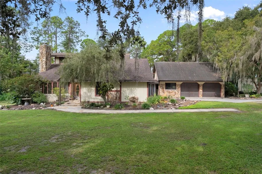 LOCATION, LOCATION, LOCATION! This property is offering both privacy and city convenience! This exceptional property has it all, it is charming and very unique but is in need of some TLC. No HOA, No Deed Restrictions, No CDD. This 3-bedroom 2-bath home sits on 2.2 acres of beautiful grounds with amazing wildlife. Welcome to country charm at its best! Features include large barn, large chicken coop, covered animal stall, enclosed tack room and a covered gardening/potting shed area. Plenty of space for all your toys and animals. Extra-large garage and workshop and an additional large storage building. The outdoor area is a true oasis. Inside there is an airy spacious feel to the home. Walking through the front door opens up to a lovely Livingroom with a beautiful stone wood burning fireplace, a dining room with French doors that opens out onto a large glass enclosed patio. There are two...