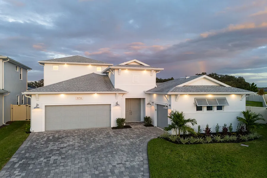 Experience luxury living in this expansive six-bedroom, 4.5-bath estate on an oversized lot in the sought-after Robin's Cove section of the Epperson Lagoon community. This home is centered around a stunning pool with courtyard-style floor plan, providing a private oasis with seamless indoor and outdoor living space. The central pool features a heated spa, LED lighting and pencil jet fountain accents, while the detached pool house guest suite offers unparalleled flexibility for visitors, or a private home office. Go inside to discover an upgraded interior, defined by tall ceilings and elegant finishes, including crown molding, shiplap accent walls in key areas and tile accent walls in all baths. Entertainment is effortless with a striking feature wall with custom shelving, integrated surround sound speakers in the family room, primary suite and loft, along with a floating tray ceiling in the kitchen accompanied by accent lighting. Organized storage is plentiful with designated mudroom, shelving in the pantry, and custom built-out closets in every bedroom. Comfort is assured with motorized roller shades in primary rooms, and either shutters or custom drapery can be found on all windows. Outside, the property is a private resort featuring lush tropical landscaping, a massive fenced-in yard, and ample lanai space equipped with ceiling fans, built-in speakers and a TV connection for ultimate outdoor enjoyment. The entertainment continues with an included playground and a basketball court, while the garage features stylish epoxy flooring. Other features of this home include dual zoned air-conditioning systems, soffit lighting around the entire home's exterior, along with tinted windows and sliders. This exceptional property is in the famous Epperson Ranch Crystal Lagoon neighborhood, which is comprised of 7.5 acres of clear blue water including sandy beaches, swim-up bar, and neighborhood features showcasing UltraFi, a community-wide internet and cable experience, Streetleaf solar streetlights, playgrounds, golf cart paths, miles of trails, green spaces and dog parks. This growing area is home to the sought-after Innovation Preparatory Academy and The Kirkland Ranch Academy of Innovation schools, plus a new Publix, Starbucks and Chick-fil-A, while also conveniently minutes from Interstate 75 providing ample shopping and dining options at Tampa Premium Outlets, Shops at Wiregrass, and The Grove & KRATE.