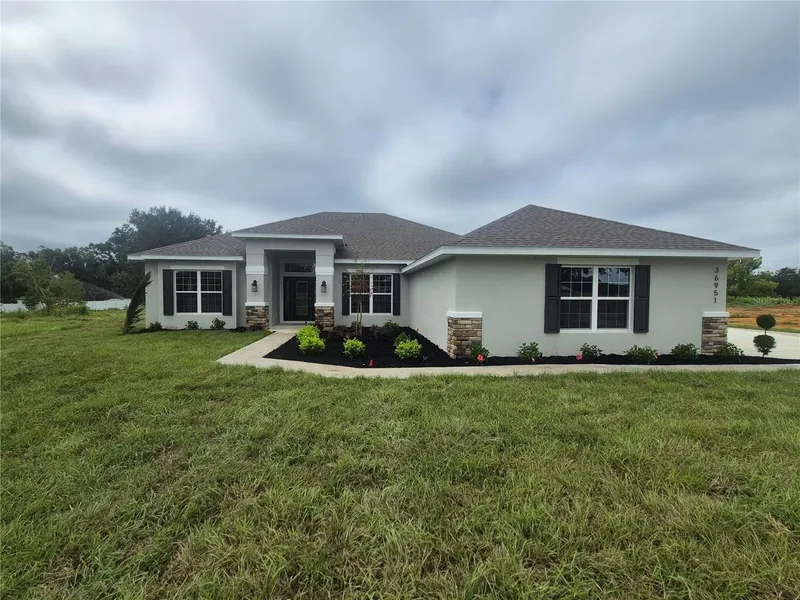 Why wait to build? This brand-new Adams Homes estate home offers 4 bedrooms, 2 bathrooms, a living room, and a separate family room on a full one-acre homesite in Hill Country Estates. Step inside to an open, spacious layout with ceramic tile in main areas, plush carpeted bedrooms, vaulted ceilings, and beautiful backyard views. The modern kitchen features snow soft-close cabinetry, granite countertops, a deep drawer bank, trash/recycle pullout, pantry, breakfast nook, and generous countertop space perfect for everyday living and entertaining. The owner’s suite includes dual walk-in closets, a tiled shower, and relaxing garden tub. All bathrooms are equipped with matching granite and soft-close cabinetry. Exterior features include 42" stone accents, lush landscaping, full yard irrigation, and a 3-car side-entry garage with top-row windows and separate openers. Additional upgrades include 5¼" baseboards, double-pane low-E windows, a 50-gallon water heater, modern 5-panel doors, and a large covered lanai ideal for outdoor dining or a future pool. NO CDD and NO flood zone. Enjoy estate-style privacy with the convenience of Dade City’s charming shops, restaurants, and annual events just minutes away. Interested in seeing the quality and layout firsthand? Visit the Adams Homes model home at Abbey Glen to find out more information. Ready to move now and and start living the lifestyle you’ve been waiting for!