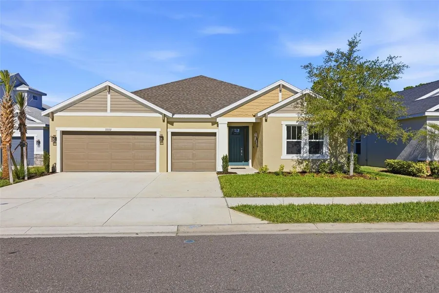 Welcome to this beautiful Saint Croix floor plan, former Model Home, never lived in, offering exceptional curb appeal, POOL and Outdoor kitchen and a refined, designer interior. The home comes with ALL FURNITURE AND DECORATION! This thoughtfully designed 2,921 sq. ft. home features 4 bedrooms and 4.5 bathrooms, with each bedroom offering a private en-suite bath and 3 Car Garage. An inviting foyer welcomes you and provides access to two secondary bedrooms. Beyond the foyer, the home opens to a spacious, open-concept beautifully finished gourmet kitchen with a center island overlooking the gathering room, perfect for entertaining. Pocket sliding glass doors lead to a large covered lanai, where you can enjoy outdoor cooking, spend time by the pool overseeing the view of the conservation lot, seamlessly blending indoor and outdoor living. Upgrades and structural options include tray ceilings, a gourmet kitchen, kitchen island knee wall, floor outlet, study in place of flex space with double French doors, 8-foot interior doors, and pocket glass sliding doors. The owner’s suite features a deluxe bath with a rain showerhead. Additional features include a laundry room cabinetry and sink, outdoor kitchen with vent, private pool, built- in ceiling audio system and thoughtfully selected design enhancements throughout. River Landing community features resort-style amenities, including a heated pool with multiple entertainment areas, grills, clubhouse, fitness center, basketball and tennis courts, a playground, and a small soccer field. Conveniently located along the SR 56 extension, this community offers easy access to shopping, entertainment, and dining options. Don't miss out and schedule your private tour today!